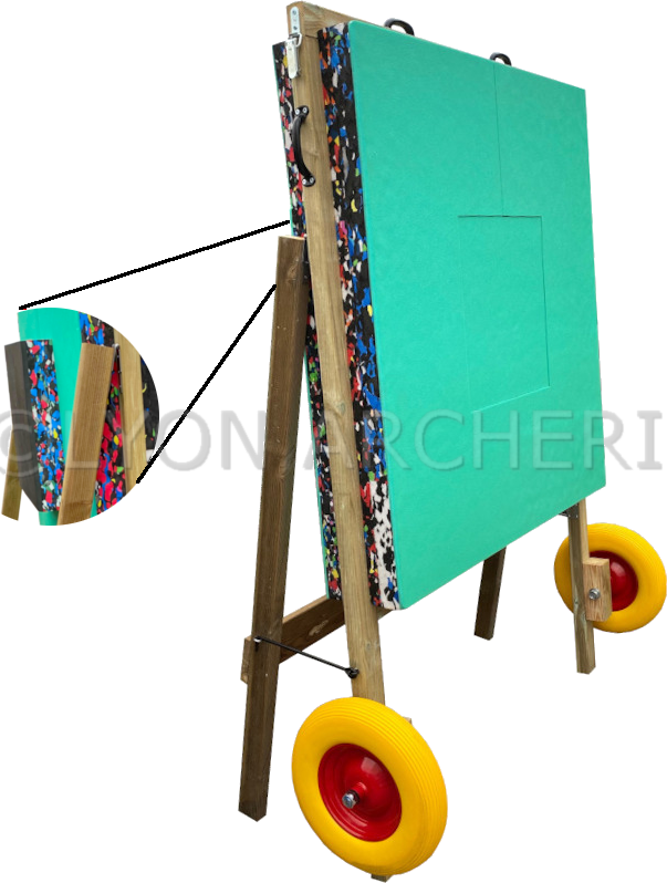 La structure de ce chevalet a été spécialement conçue pour y intégrer n'importe quelle cible mousse Lyon Archerie : Bloc'TECH, Lam'TECH ou Cible Agglo. les cadre s'insérant directement dans la cible afin de la maintenir en place pour les déplacement et pour offrir une meilleur stabilité.