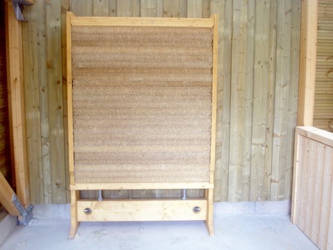 Compression par 3 vérins de 27 mm de diam. Structure en bois du nord 1er choix provenance de Norvège. Traité avec teinte extérieur chêne clair en 2 couches garantie 3 ans par Helliotan professionnel BGA, lasure de finition transparente à base de résine acrylique.