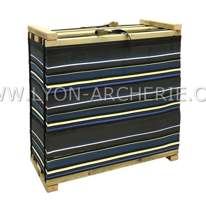 La cible LAM’ECH de Lyon Archerie est comprimée à l’aide de traverses de 4cm d’épaisseur ce qui permet une grande résistance à la déformation. Les cibles a partir de 100 cm sont comprimées avec 3 traverses pour augmenter cette résistance et maintenir une compression optimale. Le bois utilisé est un bois traité autoclave classe4, c’est a dire résistant à toute les intempéries. Votre cible peut donc dormir dehors sans risquer de se dégrader avec l’humidité.